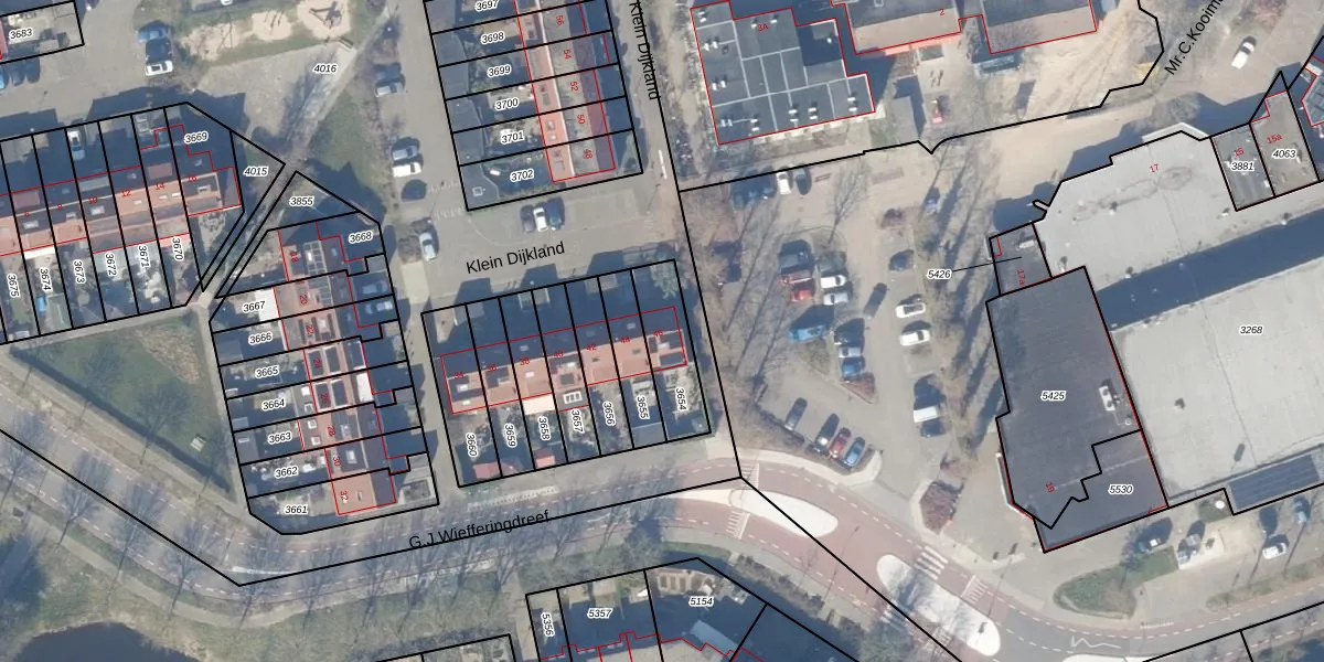 Klein Dijkland 46 is gelegen op kadastraal perceel WEE02B3654. Deze kadastrale aanduiding is uniek en wordt gebruikt door het Kadaster om eigendomsrechten en andere zakelijke rechten vast te leggen. Het perceel maakt onderdeel uit van de kadastrale gemeente Weesp.