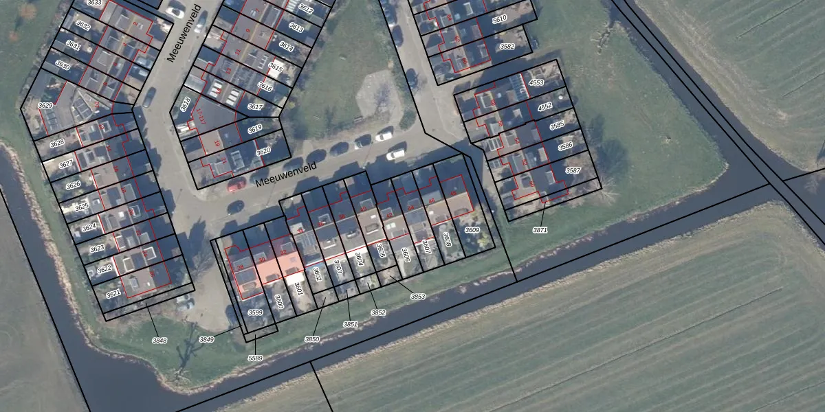 Meeuwenveld 44 is gelegen op kadastraal perceel WEE02B3607. Deze kadastrale aanduiding is uniek en wordt gebruikt door het Kadaster om eigendomsrechten en andere zakelijke rechten vast te leggen. Het perceel maakt onderdeel uit van de kadastrale gemeente Weesp.