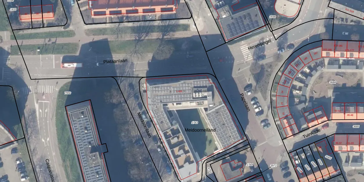 Het perceel waarop Meidoorneiland 106 staat heeft een oppervlakte van 2195 m². Dit is een zeer groot perceel. De perceeloppervlakte wordt geregistreerd door het Kadaster. Gedetailleerde informatie over de maten van dit perceel kunt u vinden in het rapport Kadastrale kaart met maatvoering van Meidoorneiland 106.