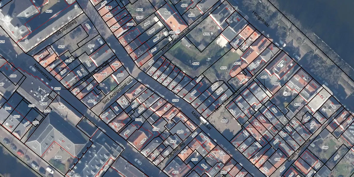 Het perceel waarop Middenstraat 81 staat heeft een oppervlakte van 44 m². Dit is een klein perceel. De perceeloppervlakte wordt geregistreerd door het Kadaster. Gedetailleerde informatie over de maten van dit perceel kunt u vinden in het rapport Kadastrale kaart met maatvoering van Middenstraat 81.