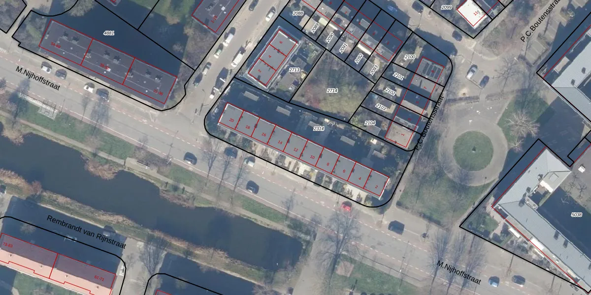 Het perceel waarop M.Nijhoffstraat 12 staat heeft een oppervlakte van 1450 m². Dit is een zeer groot perceel. De perceeloppervlakte wordt geregistreerd door het Kadaster. Gedetailleerde informatie over de maten van dit perceel kunt u vinden in het rapport Kadastrale kaart met maatvoering van M.Nijhoffstraat 12.