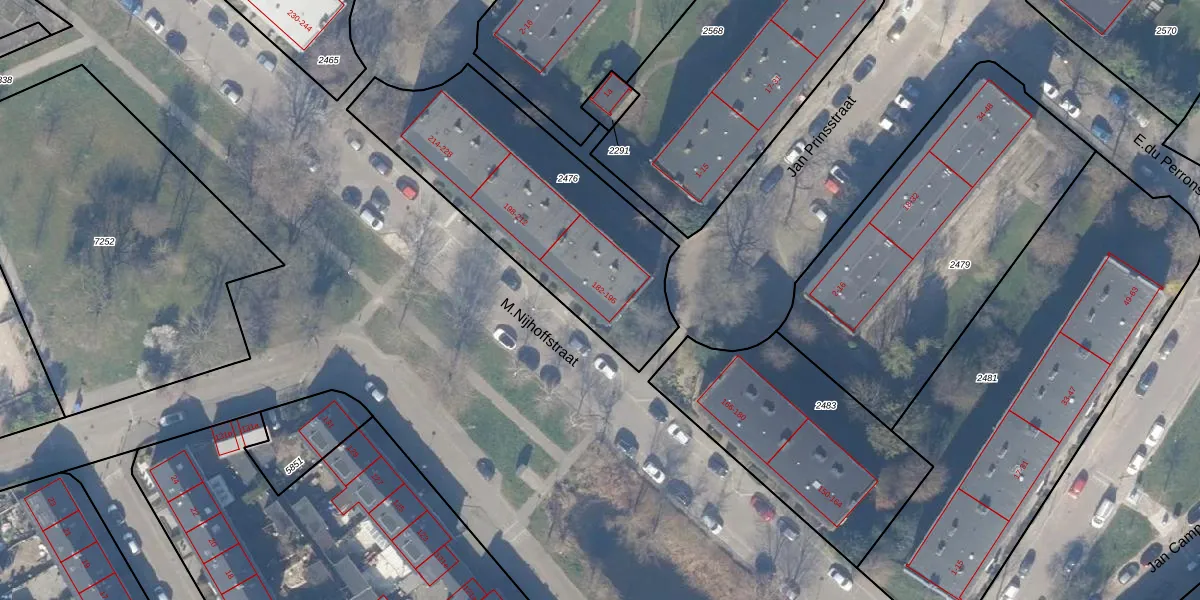 M.Nijhoffstraat 182 is gelegen op kadastraal perceel WEE02B2476. Deze kadastrale aanduiding is uniek en wordt gebruikt door het Kadaster om eigendomsrechten en andere zakelijke rechten vast te leggen. Het perceel maakt onderdeel uit van de kadastrale gemeente Weesp.