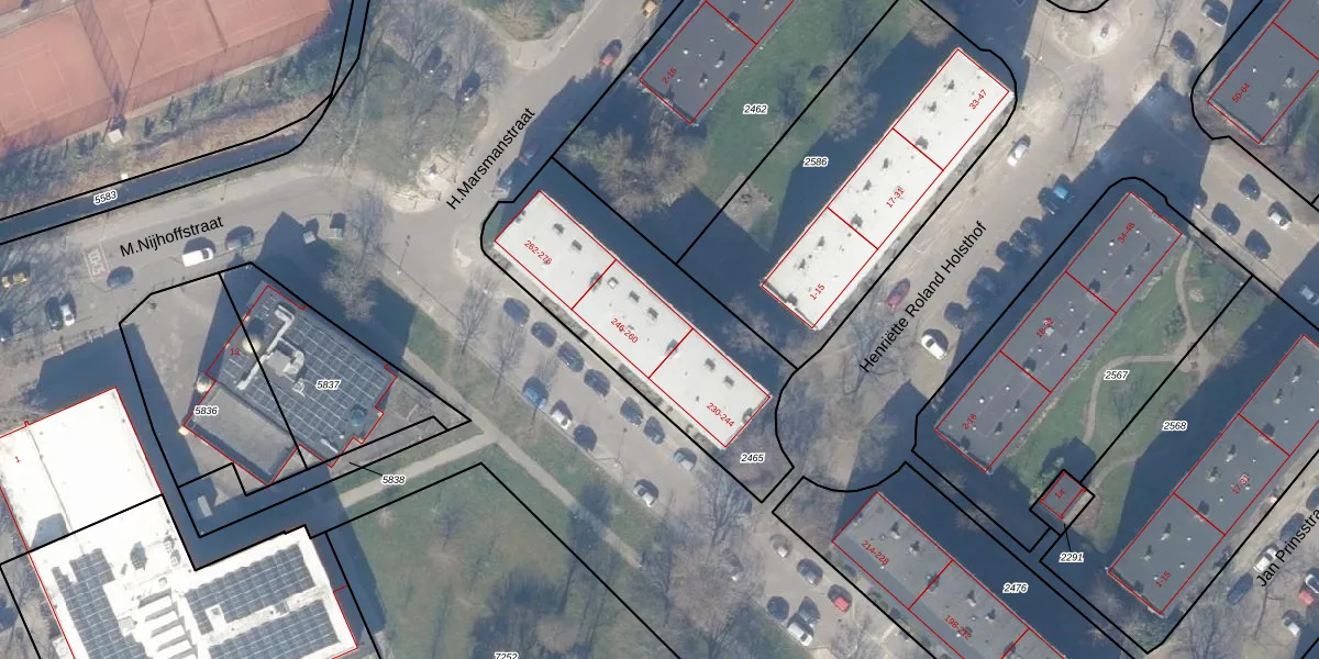 Het perceel waarop M.Nijhoffstraat 250 staat heeft een oppervlakte van 1007 m². Dit is een zeer groot perceel. De perceeloppervlakte wordt geregistreerd door het Kadaster. Gedetailleerde informatie over de maten van dit perceel kunt u vinden in het rapport Kadastrale kaart met maatvoering van M.Nijhoffstraat 250.