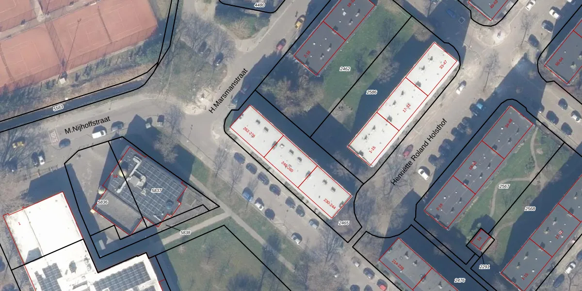 Het perceel waarop M.Nijhoffstraat 260 staat heeft een oppervlakte van 1007 m². Dit is een zeer groot perceel. De perceeloppervlakte wordt geregistreerd door het Kadaster. Gedetailleerde informatie over de maten van dit perceel kunt u vinden in het rapport Kadastrale kaart met maatvoering van M.Nijhoffstraat 260.