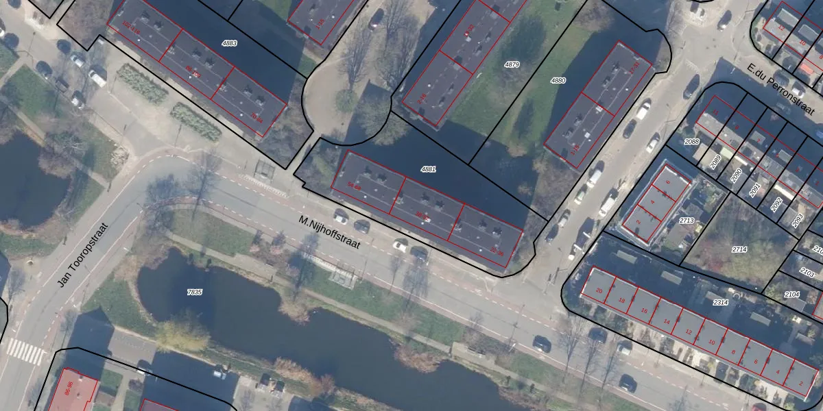 Het perceel waarop M.Nijhoffstraat 48 staat heeft een oppervlakte van 1194 m². Dit is een zeer groot perceel. De perceeloppervlakte wordt geregistreerd door het Kadaster. Gedetailleerde informatie over de maten van dit perceel kunt u vinden in het rapport Kadastrale kaart met maatvoering van M.Nijhoffstraat 48.