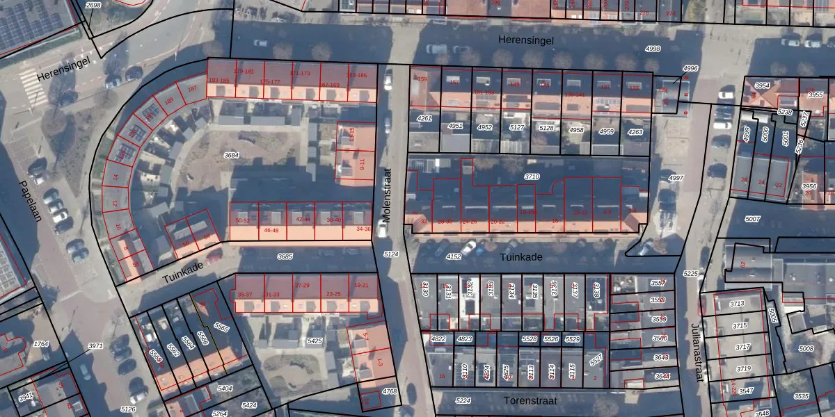 Het perceel waarop Molenstraat 2 staat heeft een oppervlakte van 1081 m². Dit is een zeer groot perceel. De perceeloppervlakte wordt geregistreerd door het Kadaster. Gedetailleerde informatie over de maten van dit perceel kunt u vinden in het rapport Kadastrale kaart met maatvoering van Molenstraat 2.