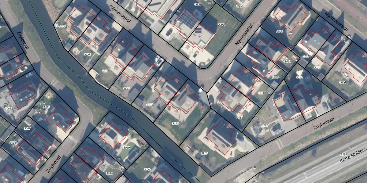 Het perceel waarop Nijenrodehof 12 staat heeft een oppervlakte van 601 m². Dit is een groot perceel. De perceeloppervlakte wordt geregistreerd door het Kadaster. Gedetailleerde informatie over de maten van dit perceel kunt u vinden in het rapport Kadastrale kaart met maatvoering van Nijenrodehof 12.
