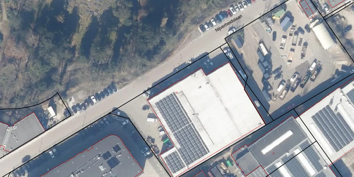 Het perceel waarop Nijverheidslaan 1-b staat heeft een oppervlakte van 3300 m². Dit is een zeer groot perceel. De perceeloppervlakte wordt geregistreerd door het Kadaster. Gedetailleerde informatie over de maten van dit perceel kunt u vinden in het rapport Kadastrale kaart met maatvoering van Nijverheidslaan 1-b.