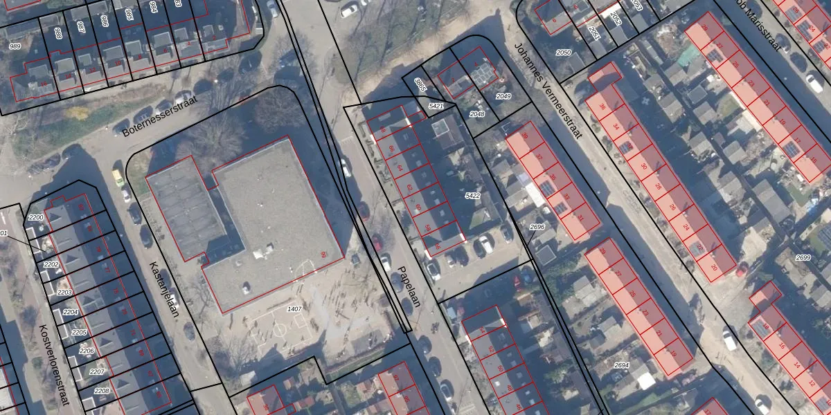 Het perceel waarop Papelaan 60 staat heeft een oppervlakte van 1170 m². Dit is een zeer groot perceel. De perceeloppervlakte wordt geregistreerd door het Kadaster. Gedetailleerde informatie over de maten van dit perceel kunt u vinden in het rapport Kadastrale kaart met maatvoering van Papelaan 60.