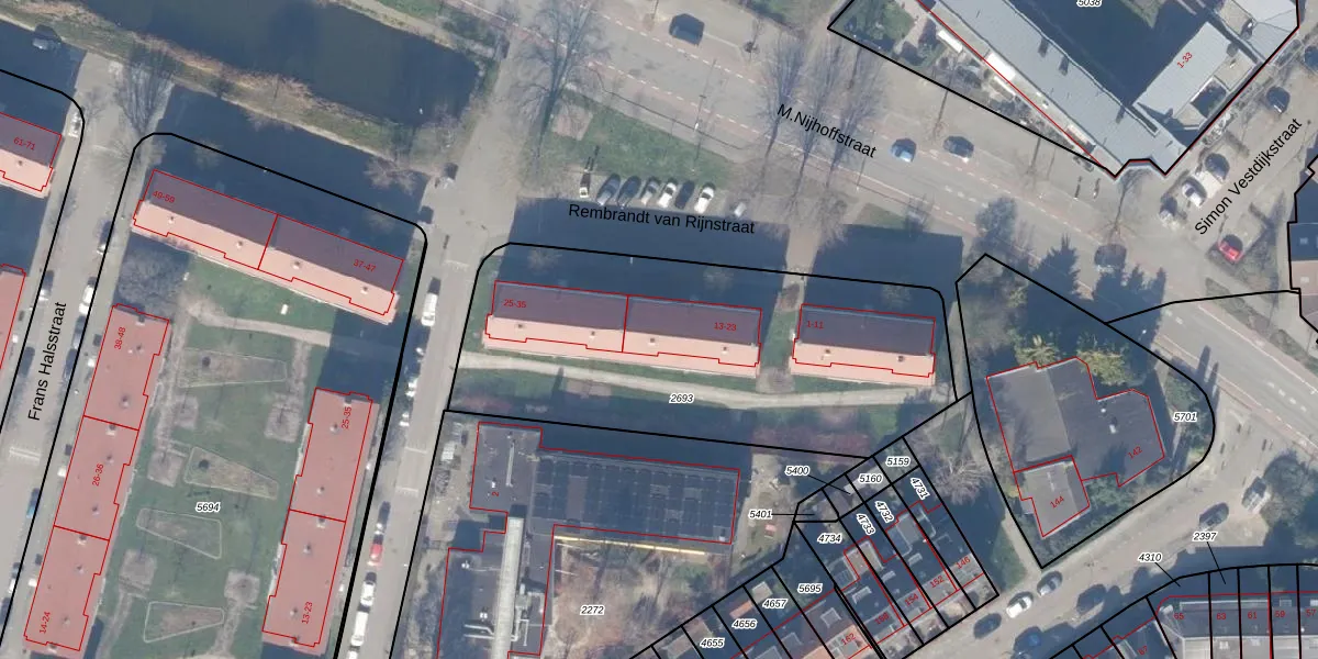 Rembrandt van Rijnstraat 21 is gelegen op kadastraal perceel WEE02B2693. Deze kadastrale aanduiding is uniek en wordt gebruikt door het Kadaster om eigendomsrechten en andere zakelijke rechten vast te leggen. Het perceel maakt onderdeel uit van de kadastrale gemeente Weesp.