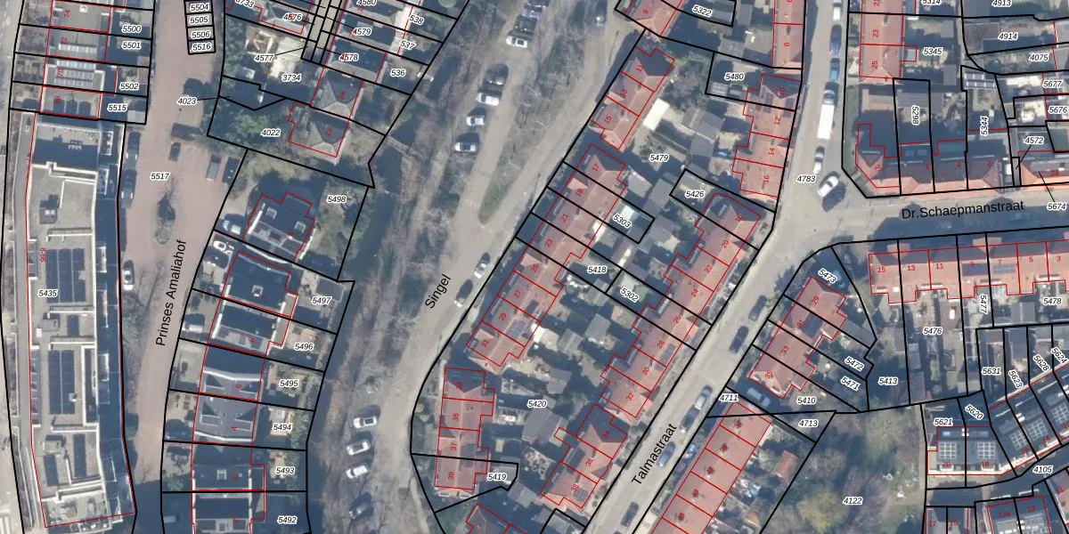 Het perceel waarop Singel 25 staat heeft een oppervlakte van 1836 m². Dit is een zeer groot perceel. De perceeloppervlakte wordt geregistreerd door het Kadaster. Gedetailleerde informatie over de maten van dit perceel kunt u vinden in het rapport Kadastrale kaart met maatvoering van Singel 25.