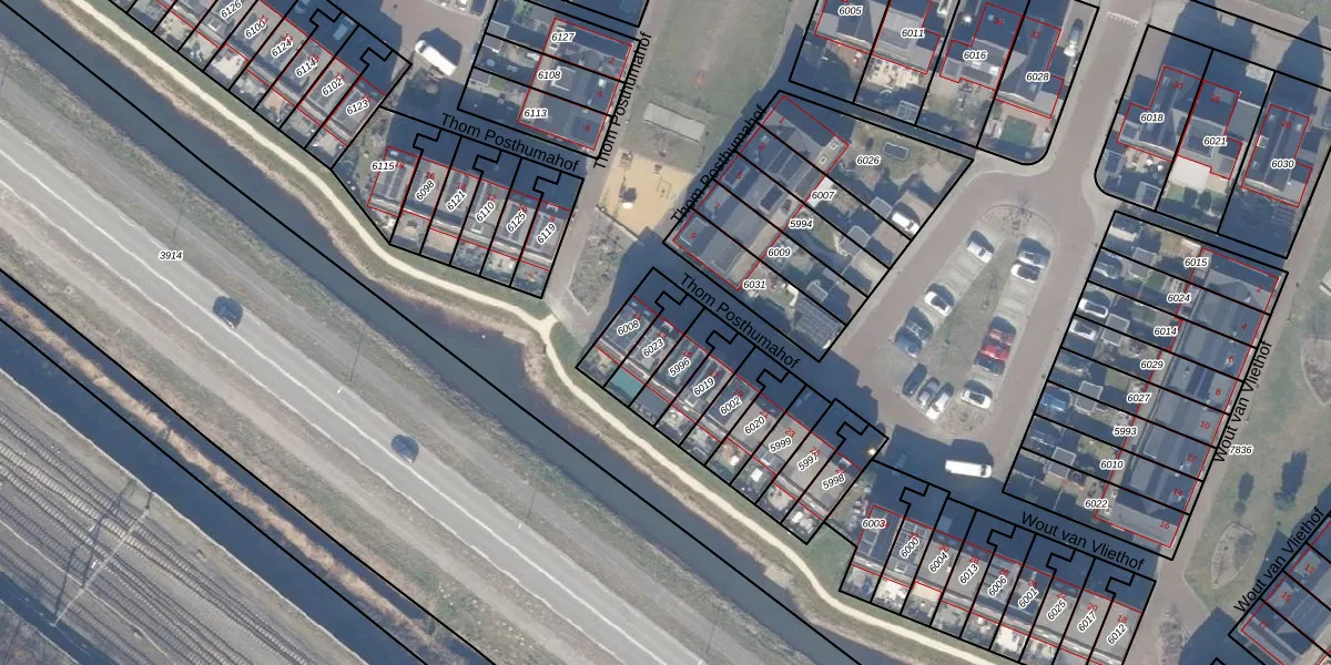 Het perceel waarop Thom Posthumahof 13 staat heeft een oppervlakte van 91 m². Dit is een klein perceel. De perceeloppervlakte wordt geregistreerd door het Kadaster. Gedetailleerde informatie over de maten van dit perceel kunt u vinden in het rapport Kadastrale kaart met maatvoering van Thom Posthumahof 13.