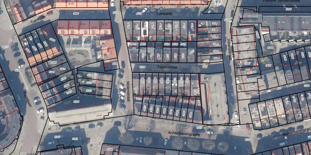 Het perceel waarop Torenstraat 13 staat heeft een oppervlakte van 60 m². Dit is een klein perceel. De perceeloppervlakte wordt geregistreerd door het Kadaster. Gedetailleerde informatie over de maten van dit perceel kunt u vinden in het rapport Kadastrale kaart met maatvoering van Torenstraat 13.