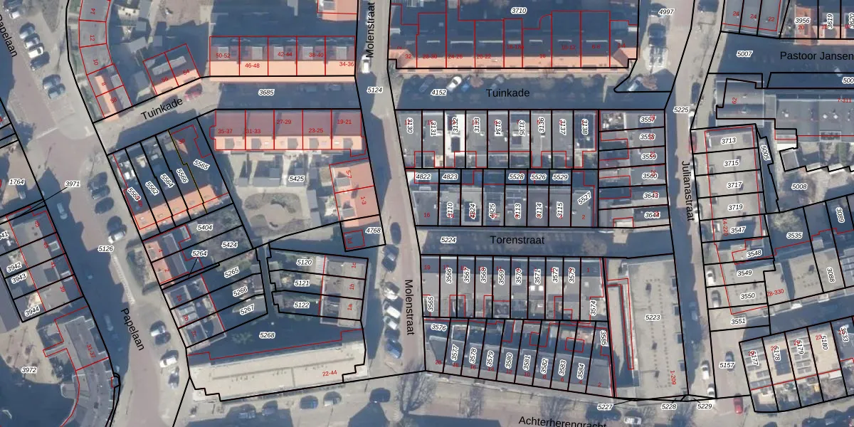 Het perceel waarop Torenstraat 16 staat heeft een oppervlakte van 88 m². Dit is een klein perceel. De perceeloppervlakte wordt geregistreerd door het Kadaster. Gedetailleerde informatie over de maten van dit perceel kunt u vinden in het rapport Kadastrale kaart met maatvoering van Torenstraat 16.