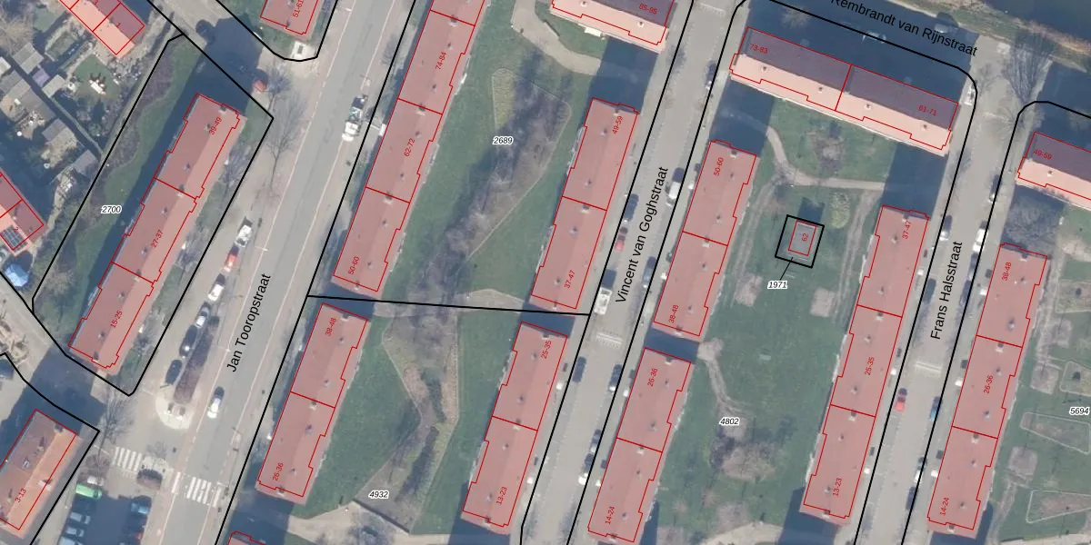Het perceel waarop Vincent van Goghstraat 41 staat heeft een oppervlakte van 3541 m². Dit is een zeer groot perceel. De perceeloppervlakte wordt geregistreerd door het Kadaster. Gedetailleerde informatie over de maten van dit perceel kunt u vinden in het rapport Kadastrale kaart met maatvoering van Vincent van Goghstraat 41.