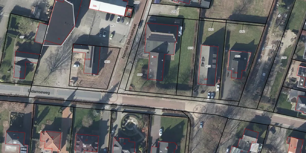 Het perceel waarop Didamseweg 22-C staat heeft een oppervlakte van 1417 m². Dit is een zeer groot perceel. De perceeloppervlakte wordt geregistreerd door het Kadaster. Gedetailleerde informatie over de maten van dit perceel kunt u vinden in het rapport Kadastrale kaart met maatvoering van Didamseweg 22-C.