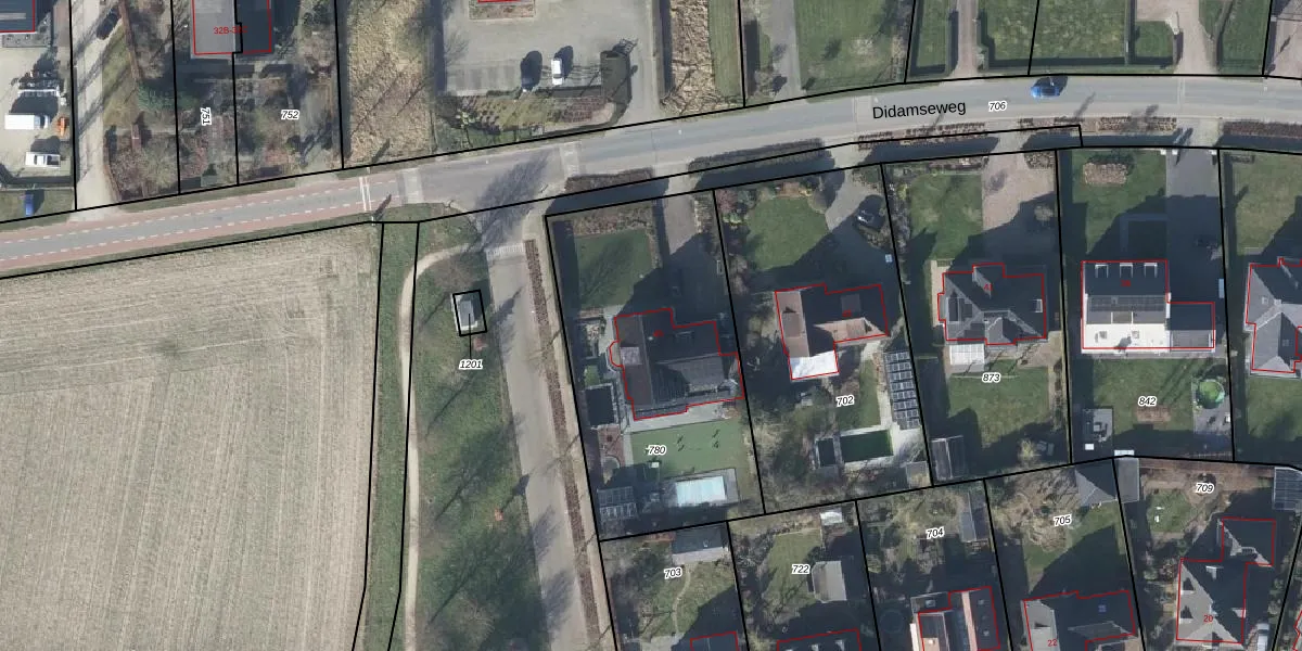 Het perceel waarop Didamseweg 45 staat heeft een oppervlakte van 1320 m². Dit is een zeer groot perceel. De perceeloppervlakte wordt geregistreerd door het Kadaster. Gedetailleerde informatie over de maten van dit perceel kunt u vinden in het rapport Kadastrale kaart met maatvoering van Didamseweg 45.
