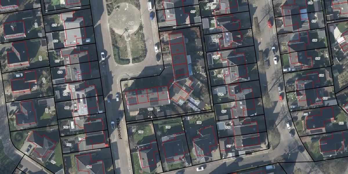 Het perceel waarop Frankenerf 23 staat heeft een oppervlakte van 1768 m². Dit is een zeer groot perceel. De perceeloppervlakte wordt geregistreerd door het Kadaster. Gedetailleerde informatie over de maten van dit perceel kunt u vinden in het rapport Kadastrale kaart met maatvoering van Frankenerf 23.