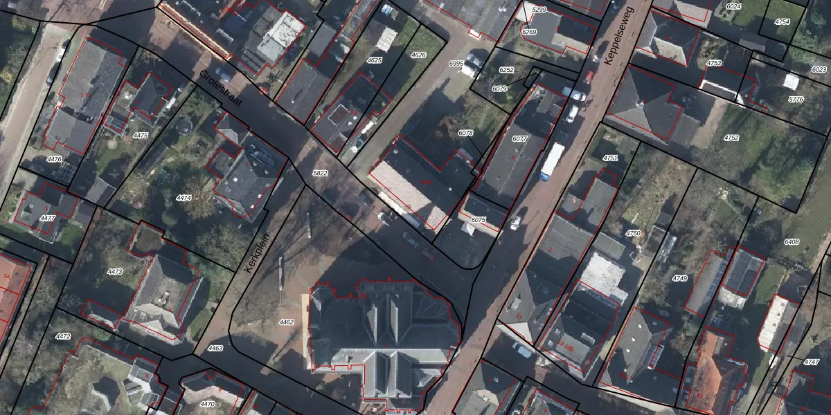 Het perceel waarop Grotestraat 9 staat heeft een oppervlakte van 1821 m². Dit is een zeer groot perceel. De perceeloppervlakte wordt geregistreerd door het Kadaster. Gedetailleerde informatie over de maten van dit perceel kunt u vinden in het rapport Kadastrale kaart met maatvoering van Grotestraat 9.