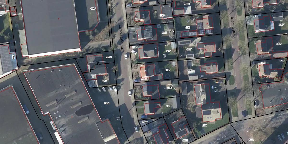Het perceel waarop Lambertusstraat 11 staat heeft een oppervlakte van 415 m². Dit is een groot perceel. De perceeloppervlakte wordt geregistreerd door het Kadaster. Gedetailleerde informatie over de maten van dit perceel kunt u vinden in het rapport Kadastrale kaart met maatvoering van Lambertusstraat 11.