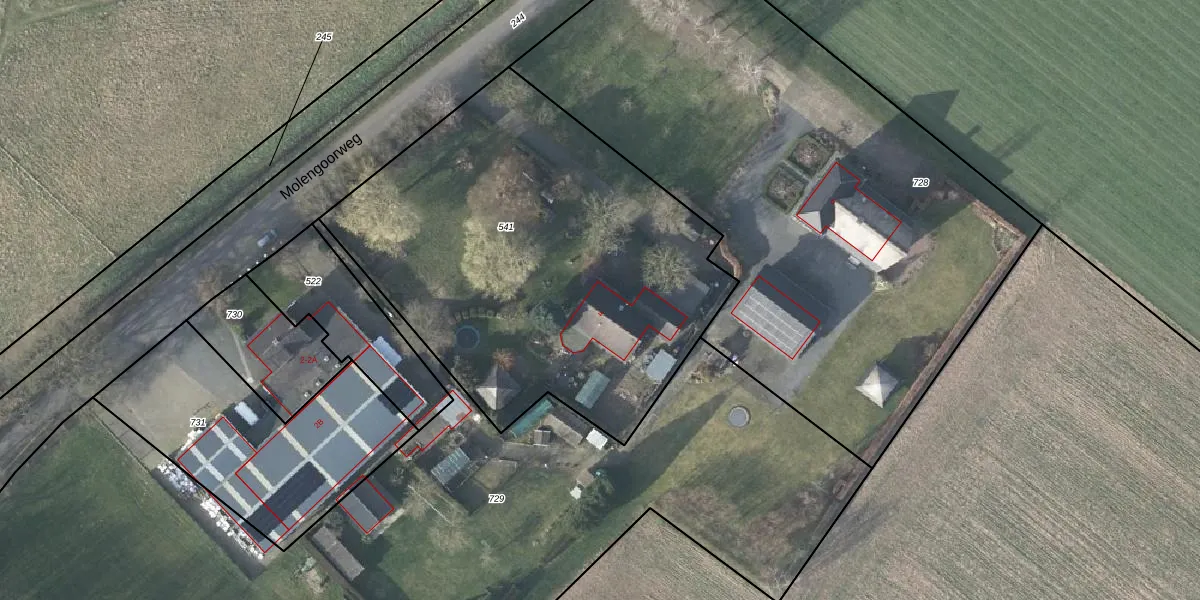 Het perceel waarop Molengoorweg 4 staat heeft een oppervlakte van 2450 m². Dit is een zeer groot perceel. De perceeloppervlakte wordt geregistreerd door het Kadaster. Gedetailleerde informatie over de maten van dit perceel kunt u vinden in het rapport Kadastrale kaart met maatvoering van Molengoorweg 4.