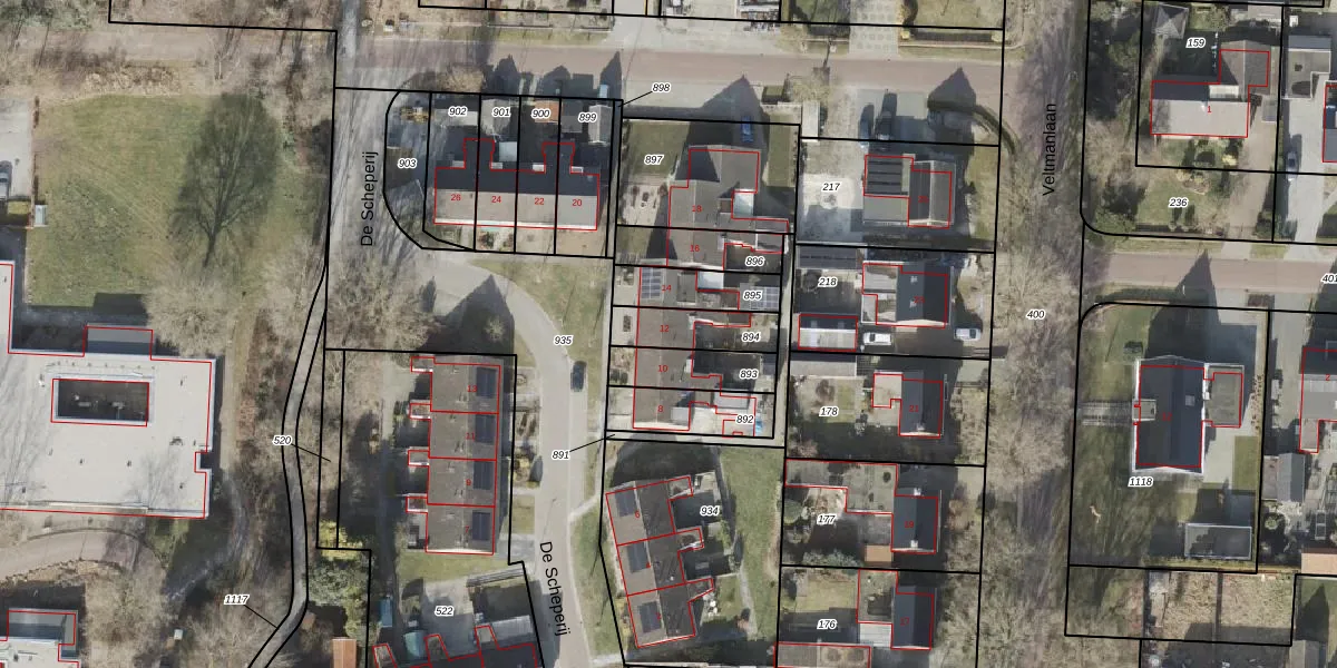Gebruik de zoekbalk of klik op een perceel voor informatie over de adressen binnen dit perceel.