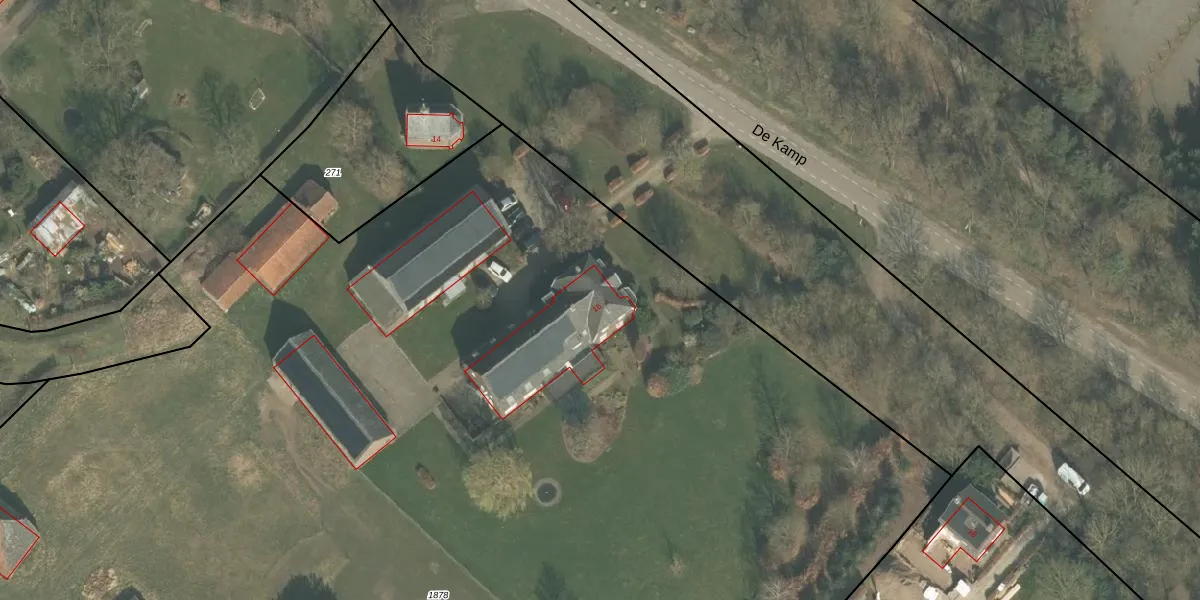 Het perceel waarop De Kamp 16 staat heeft een oppervlakte van 1,4 ha. Dit is een zeer groot perceel. De perceeloppervlakte wordt geregistreerd door het Kadaster. Gedetailleerde informatie over de maten van dit perceel kunt u vinden in het rapport Kadastrale kaart met maatvoering van De Kamp 16.
