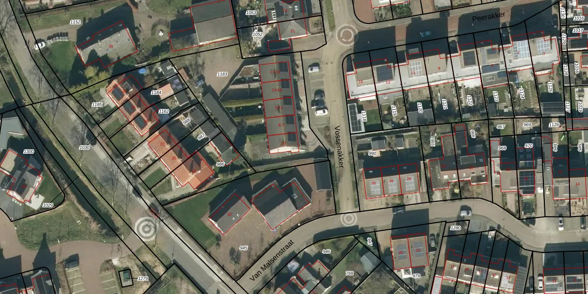 Het perceel waarop Vossenakker 1 staat heeft een oppervlakte van 1405 m². Dit is een zeer groot perceel. De perceeloppervlakte wordt geregistreerd door het Kadaster. Gedetailleerde informatie over de maten van dit perceel kunt u vinden in het rapport Kadastrale kaart met maatvoering van Vossenakker 1.