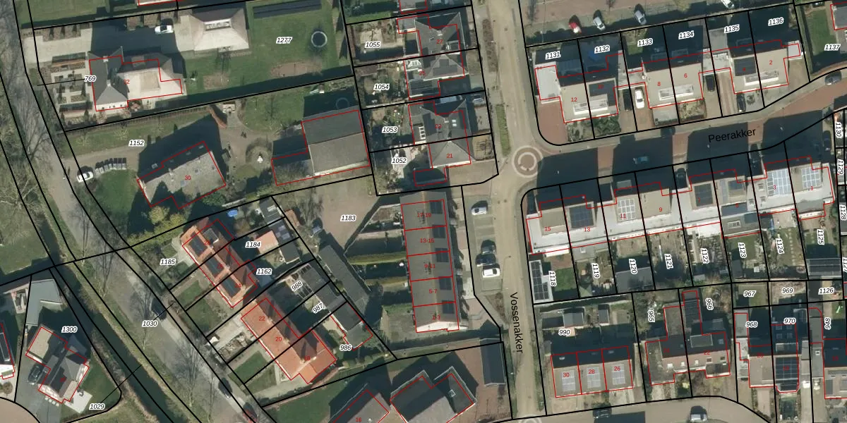 Het perceel waarop Vossenakker 19 staat heeft een oppervlakte van 1405 m². Dit is een zeer groot perceel. De perceeloppervlakte wordt geregistreerd door het Kadaster. Gedetailleerde informatie over de maten van dit perceel kunt u vinden in het rapport Kadastrale kaart met maatvoering van Vossenakker 19.
