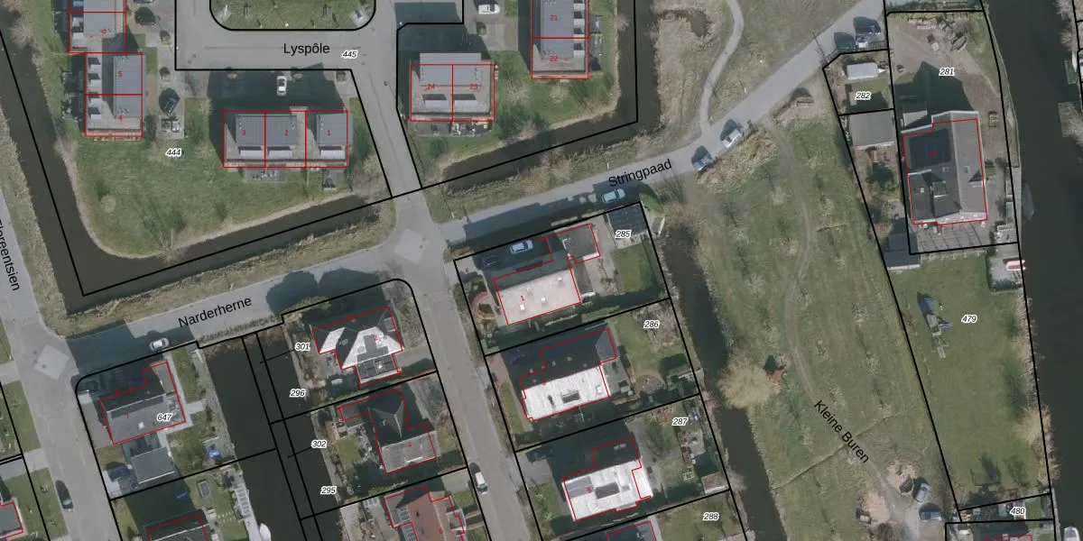 Narderherne 1 is gelegen op kadastraal perceel WRG04D285. Deze kadastrale aanduiding is uniek en wordt gebruikt door het Kadaster om eigendomsrechten en andere zakelijke rechten vast te leggen. Het perceel maakt onderdeel uit van de kadastrale gemeente Warrega.