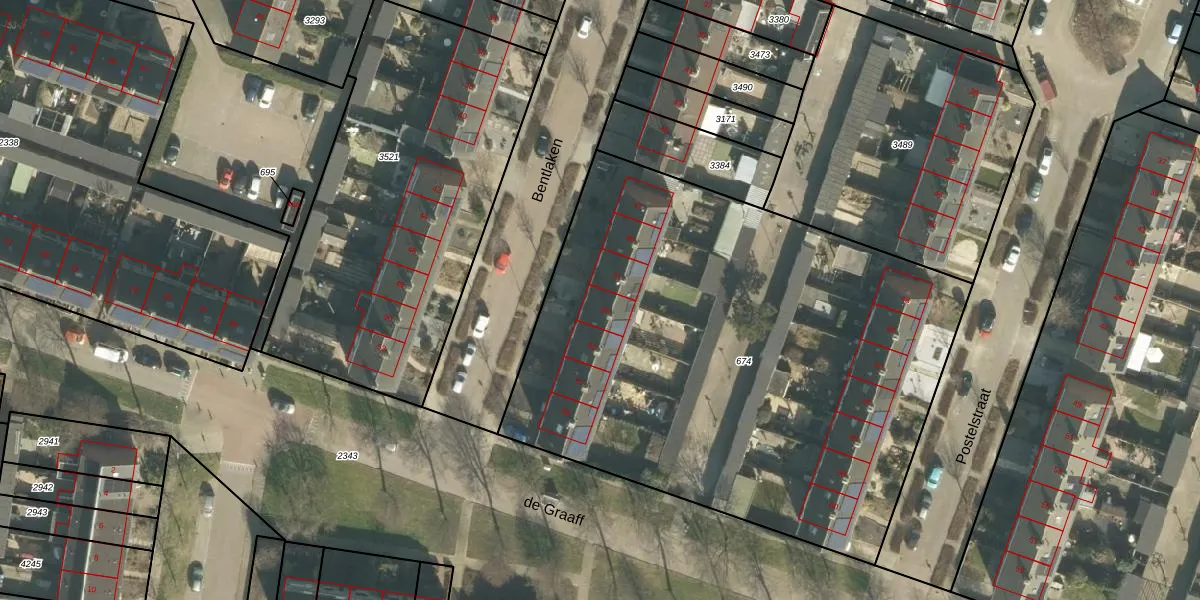 Het perceel waarop Bentlaken 53 staat heeft een oppervlakte van 3281 m². Dit is een zeer groot perceel. De perceeloppervlakte wordt geregistreerd door het Kadaster. Gedetailleerde informatie over de maten van dit perceel kunt u vinden in het rapport Kadastrale kaart met maatvoering van Bentlaken 53.