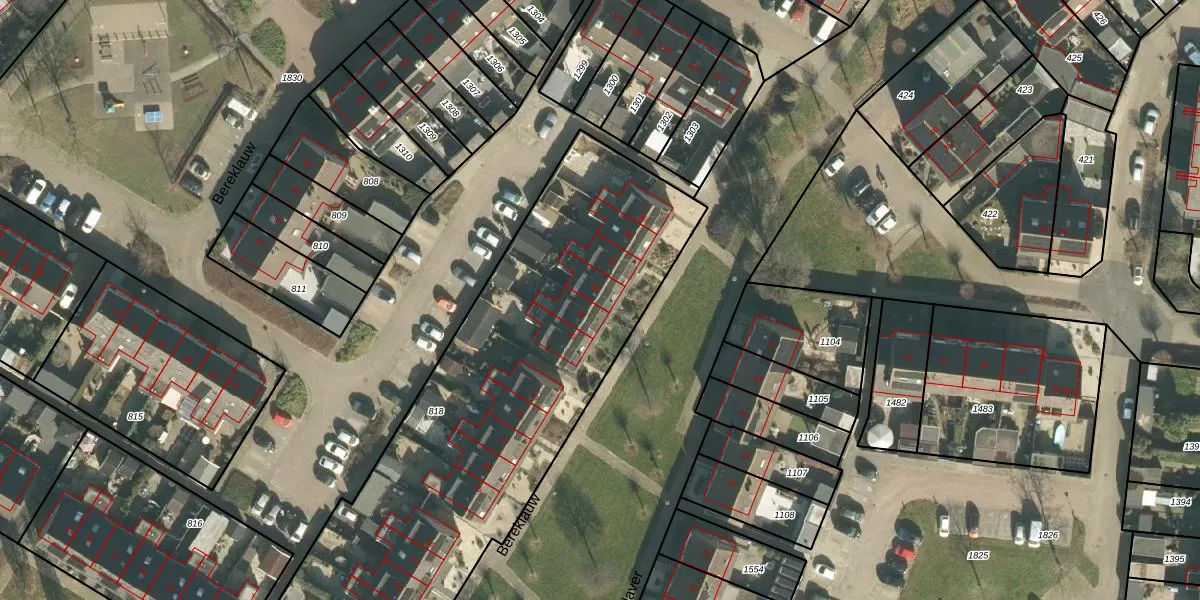 Het perceel waarop Bereklauw 80 staat heeft een oppervlakte van 2521 m². Dit is een zeer groot perceel. De perceeloppervlakte wordt geregistreerd door het Kadaster. Gedetailleerde informatie over de maten van dit perceel kunt u vinden in het rapport Kadastrale kaart met maatvoering van Bereklauw 80.