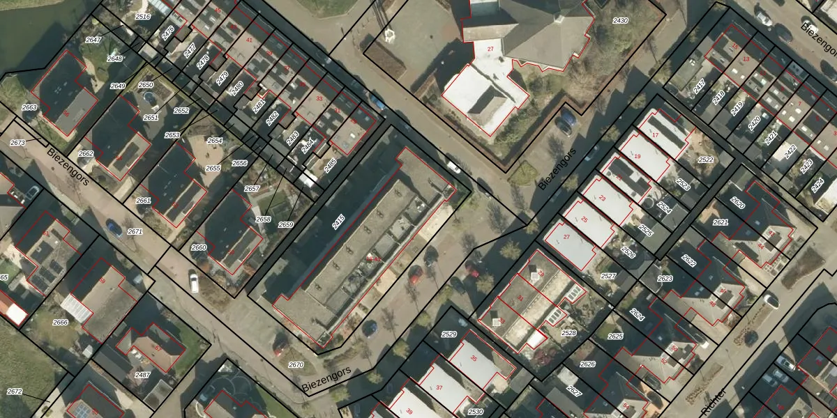 Biezengors 46 is gelegen op kadastraal perceel WKD00R2415. Deze kadastrale aanduiding is uniek en wordt gebruikt door het Kadaster om eigendomsrechten en andere zakelijke rechten vast te leggen. Het perceel maakt onderdeel uit van de kadastrale gemeente Werkendam.