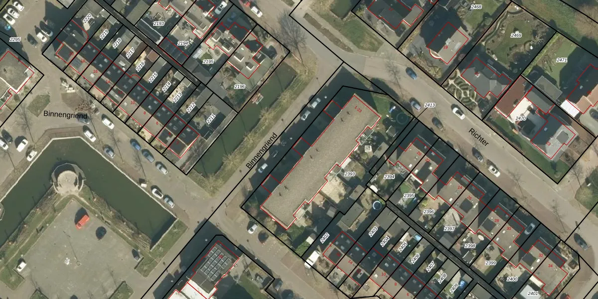 Het perceel waarop Binnengriend 13 staat heeft een oppervlakte van 1530 m². Dit is een zeer groot perceel. De perceeloppervlakte wordt geregistreerd door het Kadaster. Gedetailleerde informatie over de maten van dit perceel kunt u vinden in het rapport Kadastrale kaart met maatvoering van Binnengriend 13.