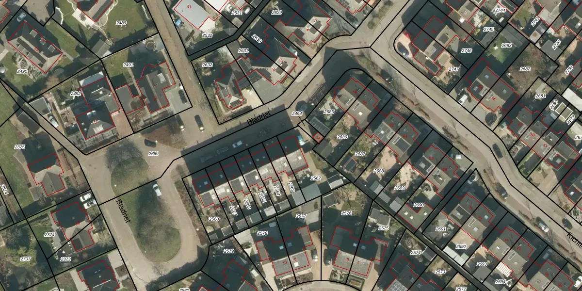 Bladriet 1 is gelegen op kadastraal perceel WKD00R2562. Deze kadastrale aanduiding is uniek en wordt gebruikt door het Kadaster om eigendomsrechten en andere zakelijke rechten vast te leggen. Het perceel maakt onderdeel uit van de kadastrale gemeente Werkendam.