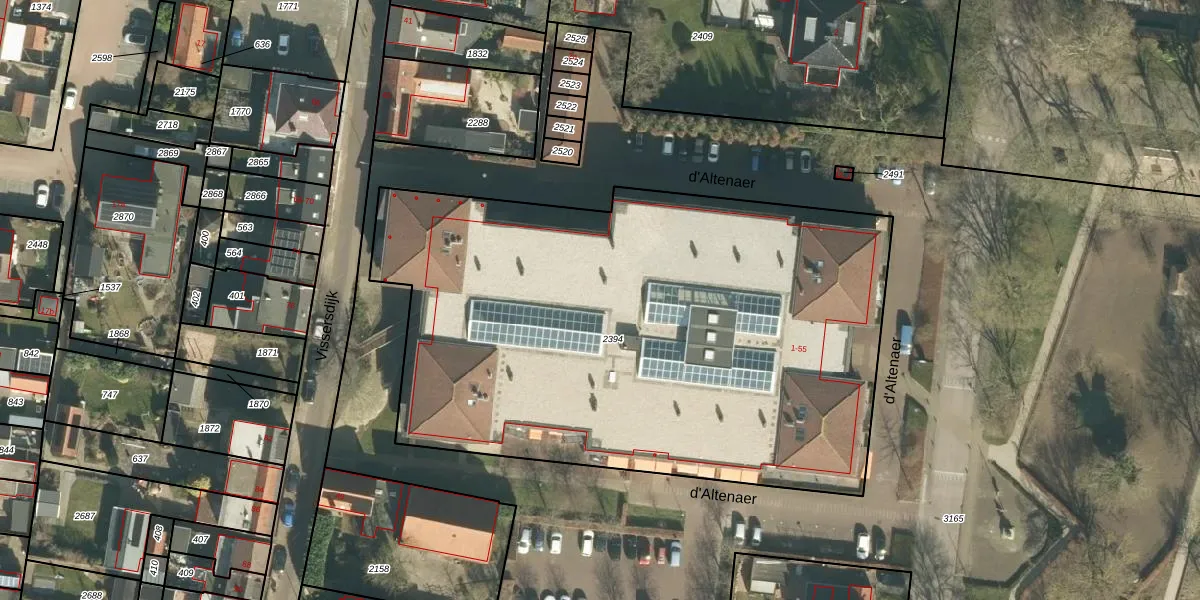 Het perceel waarop d'Altenaer 51 staat heeft een oppervlakte van 3615 m². Dit is een zeer groot perceel. De perceeloppervlakte wordt geregistreerd door het Kadaster. Gedetailleerde informatie over de maten van dit perceel kunt u vinden in het rapport Kadastrale kaart met maatvoering van d'Altenaer 51.