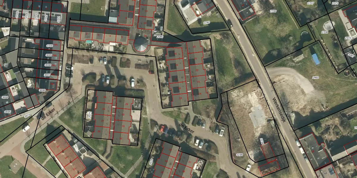 de Erker 18 is gelegen op kadastraal perceel WKD00R2080. Deze kadastrale aanduiding is uniek en wordt gebruikt door het Kadaster om eigendomsrechten en andere zakelijke rechten vast te leggen. Het perceel maakt onderdeel uit van de kadastrale gemeente Werkendam.