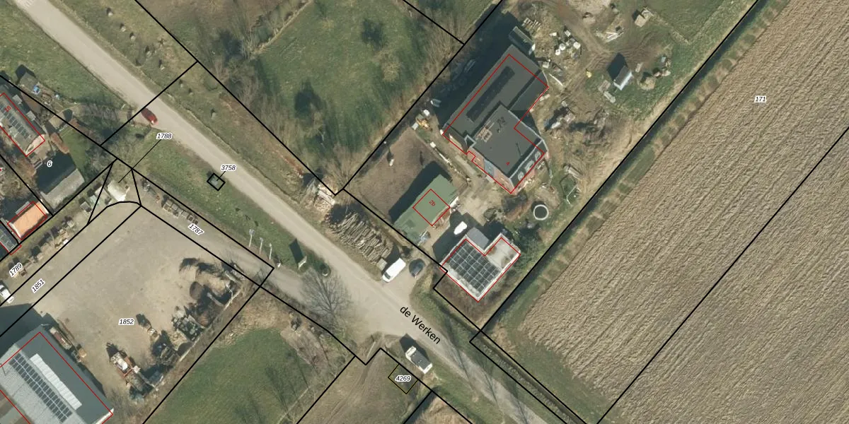 Het perceel waarop de Werken 2-b staat heeft een oppervlakte van 8010 m². Dit is een zeer groot perceel. De perceeloppervlakte wordt geregistreerd door het Kadaster. Gedetailleerde informatie over de maten van dit perceel kunt u vinden in het rapport Kadastrale kaart met maatvoering van de Werken 2-b.