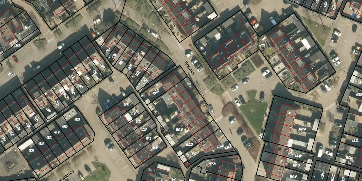 Het perceel waarop Ereprijs 63 staat heeft een oppervlakte van 779 m². Dit is een groot perceel. De perceeloppervlakte wordt geregistreerd door het Kadaster. Gedetailleerde informatie over de maten van dit perceel kunt u vinden in het rapport Kadastrale kaart met maatvoering van Ereprijs 63.