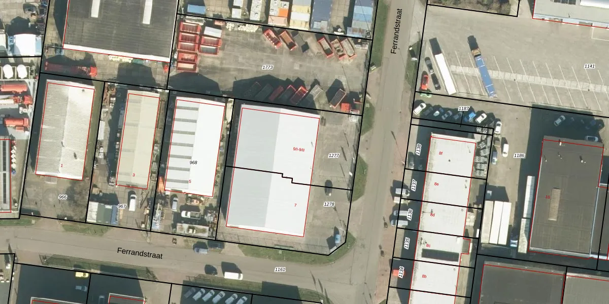 Het perceel waarop Ferrandstraat 9-I staat heeft een oppervlakte van 1006 m². Dit is een zeer groot perceel. De perceeloppervlakte wordt geregistreerd door het Kadaster. Gedetailleerde informatie over de maten van dit perceel kunt u vinden in het rapport Kadastrale kaart met maatvoering van Ferrandstraat 9-I.