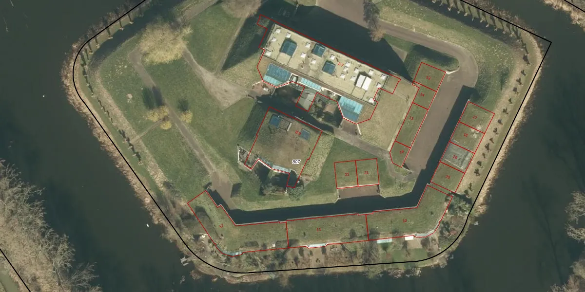 Het perceel waarop Het Fort 8 staat heeft een oppervlakte van 1,3 ha. Dit is een zeer groot perceel. De perceeloppervlakte wordt geregistreerd door het Kadaster. Gedetailleerde informatie over de maten van dit perceel kunt u vinden in het rapport Kadastrale kaart met maatvoering van Het Fort 8.