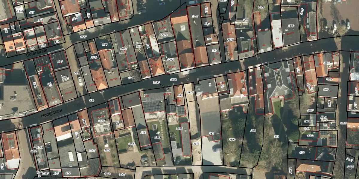 Het perceel waarop Hoogstraat 61 staat heeft een oppervlakte van 52 m². Dit is een klein perceel. De perceeloppervlakte wordt geregistreerd door het Kadaster. Gedetailleerde informatie over de maten van dit perceel kunt u vinden in het rapport Kadastrale kaart met maatvoering van Hoogstraat 61.