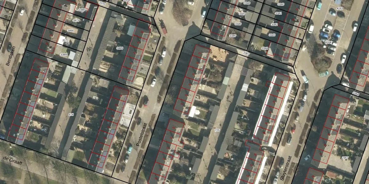 Het perceel waarop Postelstraat 45 staat heeft een oppervlakte van 5667 m². Dit is een zeer groot perceel. De perceeloppervlakte wordt geregistreerd door het Kadaster. Gedetailleerde informatie over de maten van dit perceel kunt u vinden in het rapport Kadastrale kaart met maatvoering van Postelstraat 45.