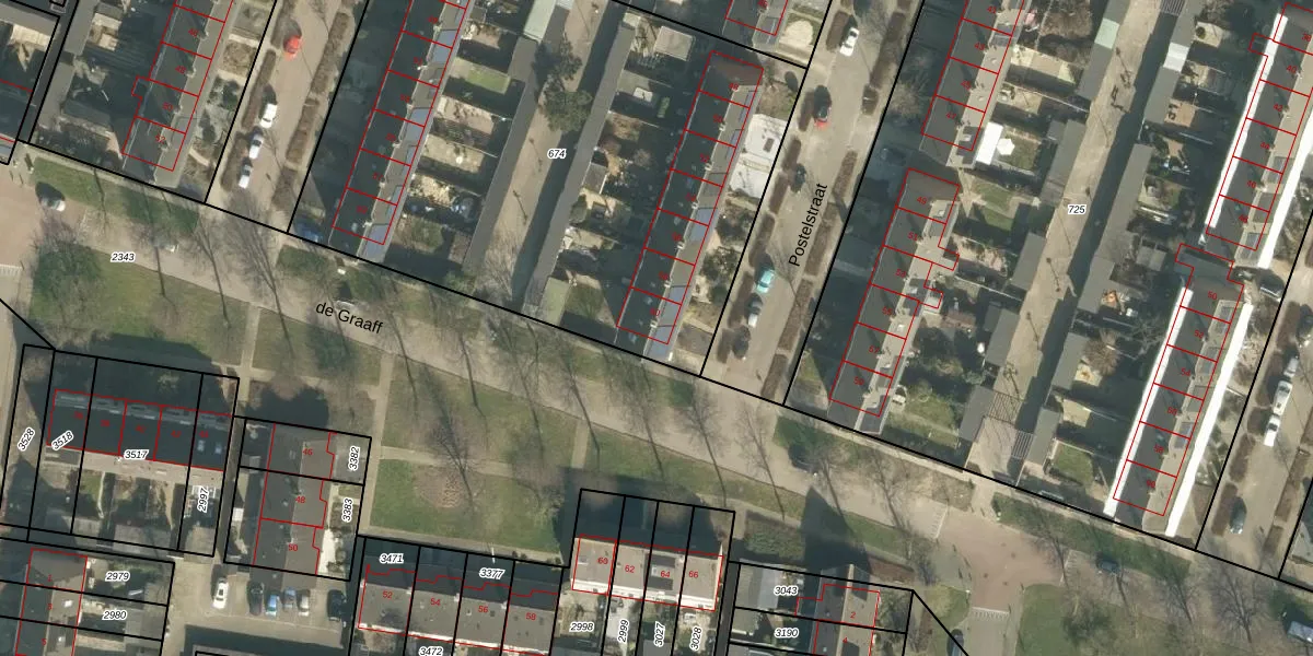 Het perceel waarop Postelstraat 60 staat heeft een oppervlakte van 3281 m². Dit is een zeer groot perceel. De perceeloppervlakte wordt geregistreerd door het Kadaster. Gedetailleerde informatie over de maten van dit perceel kunt u vinden in het rapport Kadastrale kaart met maatvoering van Postelstraat 60.
