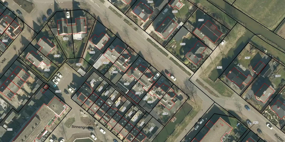 Het perceel waarop Richter 12 staat heeft een oppervlakte van 281 m². Dit is een middelgroot perceel. De perceeloppervlakte wordt geregistreerd door het Kadaster. Gedetailleerde informatie over de maten van dit perceel kunt u vinden in het rapport Kadastrale kaart met maatvoering van Richter 12.