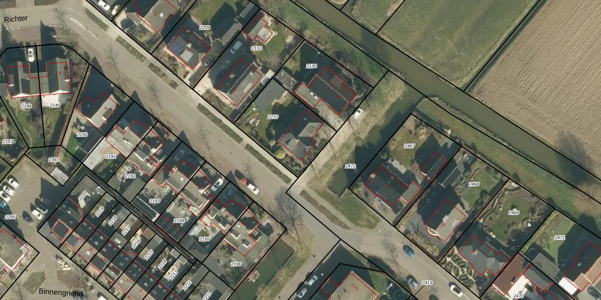 Het perceel waarop Richter 13 staat heeft een oppervlakte van 560 m². Dit is een groot perceel. De perceeloppervlakte wordt geregistreerd door het Kadaster. Gedetailleerde informatie over de maten van dit perceel kunt u vinden in het rapport Kadastrale kaart met maatvoering van Richter 13.