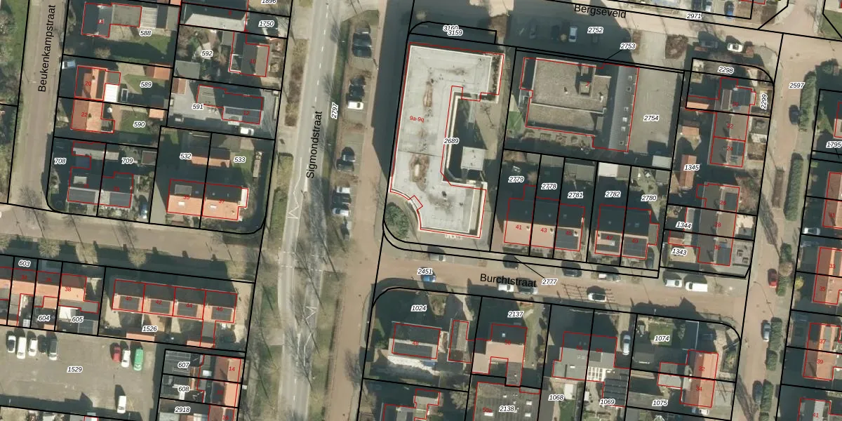 Het perceel waarop Sigmondstraat 9-q staat heeft een oppervlakte van 1265 m². Dit is een zeer groot perceel. De perceeloppervlakte wordt geregistreerd door het Kadaster. Gedetailleerde informatie over de maten van dit perceel kunt u vinden in het rapport Kadastrale kaart met maatvoering van Sigmondstraat 9-q.