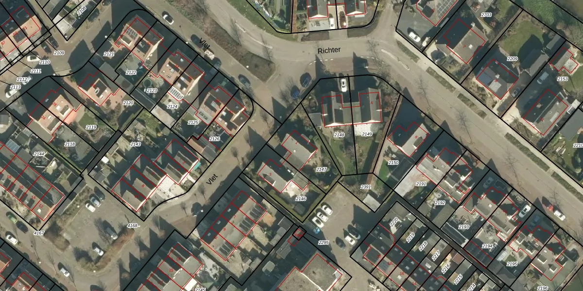 Het perceel waarop Vlet 1 staat heeft een oppervlakte van 363 m². Dit is een groot perceel. De perceeloppervlakte wordt geregistreerd door het Kadaster. Gedetailleerde informatie over de maten van dit perceel kunt u vinden in het rapport Kadastrale kaart met maatvoering van Vlet 1.