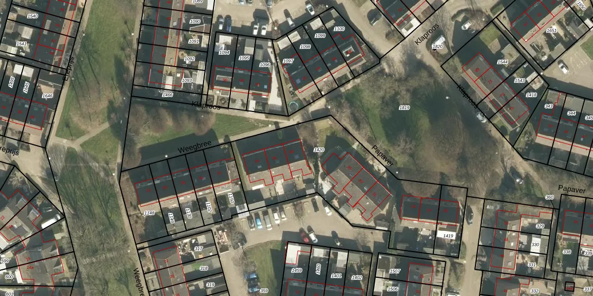 Het perceel waarop Weegbree 38 staat heeft een oppervlakte van 1705 m². Dit is een zeer groot perceel. De perceeloppervlakte wordt geregistreerd door het Kadaster. Gedetailleerde informatie over de maten van dit perceel kunt u vinden in het rapport Kadastrale kaart met maatvoering van Weegbree 38.