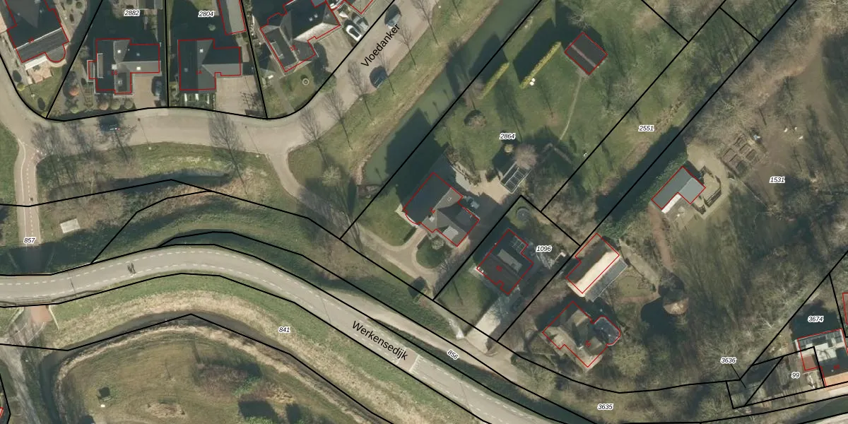 Het perceel waarop Werkensedijk 54 staat heeft een oppervlakte van 2597 m². Dit is een zeer groot perceel. De perceeloppervlakte wordt geregistreerd door het Kadaster. Gedetailleerde informatie over de maten van dit perceel kunt u vinden in het rapport Kadastrale kaart met maatvoering van Werkensedijk 54.